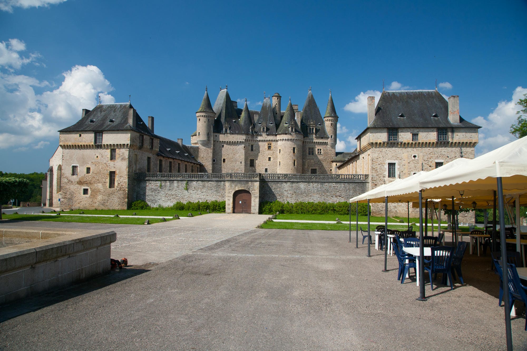 À environ 20 kilomètres du Camping Château le Verdoyer, en remontant les gorges de l’Isle vers le nord-est, on découvre Jumilhac-le-Grand — l’un des bourgs les plus attachants du Périgord Vert. Tiraillé depuis toujours entre Périgord et Limousin, le village porte cette double identité jusque dans son architecture : les maisons de pierre locale mêlent le style trapu périgourdin aux toitures d’ardoise typiquement limousines. Et sous ses terres, l’or — exploité depuis l’époque gauloise — n’a pas fini de faire rêver.