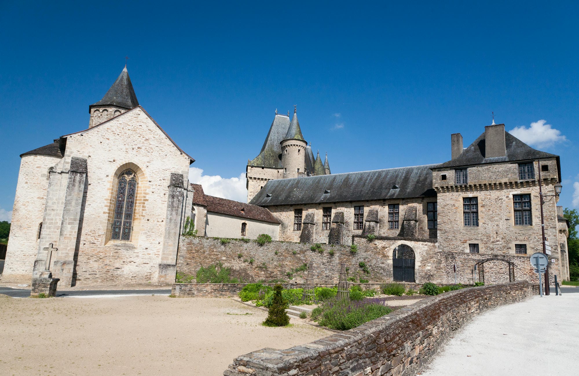La place principale, en demi-lune face à la haute courtine du château, donne le ton du village : fontaine, quelques commerces, l’office de tourisme. De là, partez à pied explorer le quartier Saint-Georges, l’un des plus anciens, avec ses maisons dont certaines portent encore la date de construction gravée sur les linteaux. Une croix monolithe, un jardin dédié aux déportés de la Seconde Guerre Mondiale, des chemins empierrés — le village se raconte à voix basse, à qui prend le temps d’écouter.