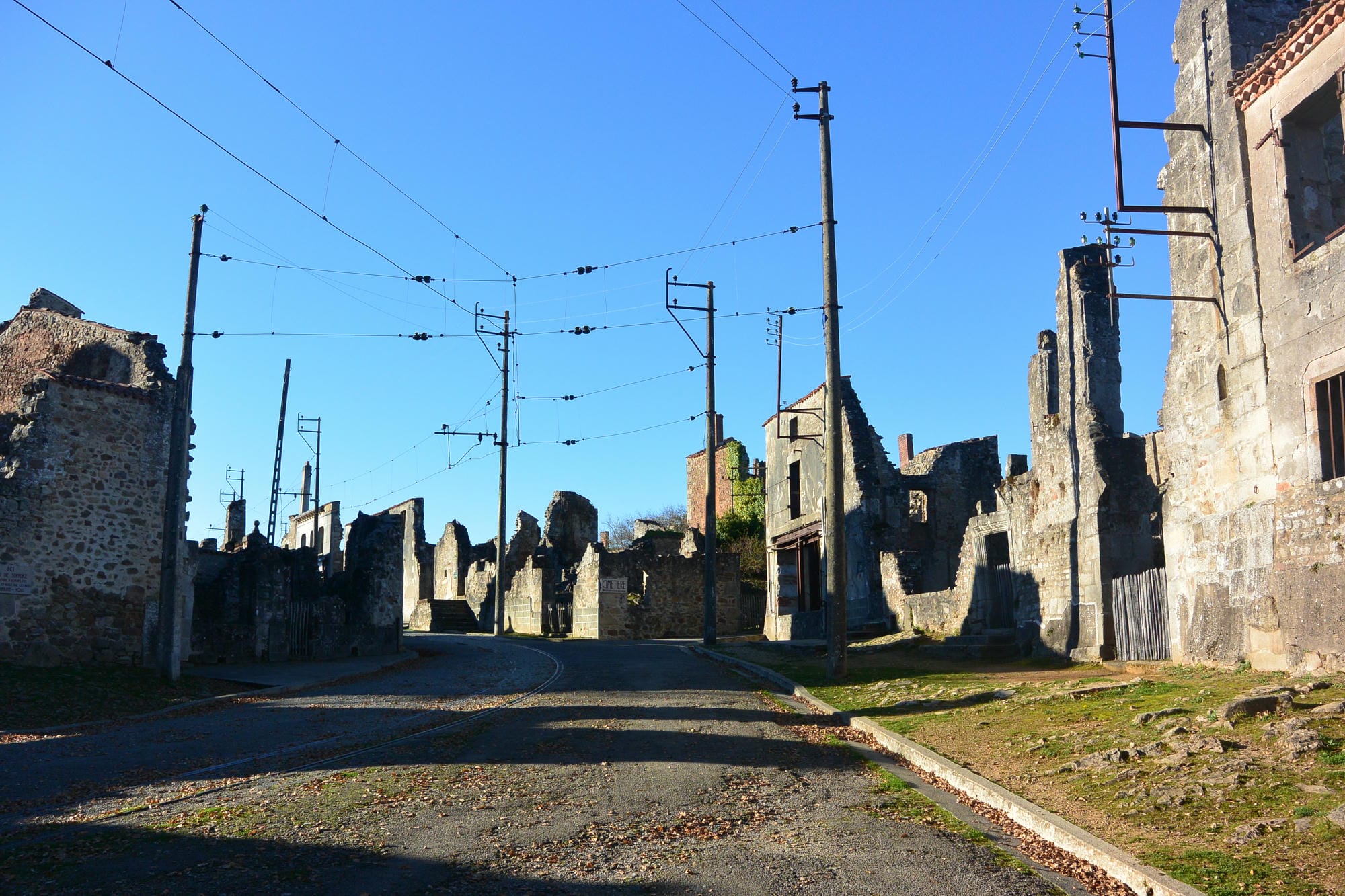 La visite des ruines du village martyr se fait en autonomie et reste gratuite. Vous déambulez dans les rues fantômes où les façades éventrées, les voitures calcinées, les ustensiles de la vie quotidienne et les rails du tramway racontent la vie paisible qui s’écoulait ici avant le drame.